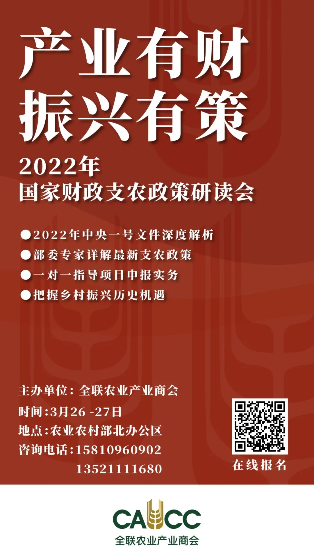 在乡村振兴的新时代里,企业需要更好地理解政策导向,把握时代机遇,获得支农资金支持,为此,全联农业产业商会拟于3月26-27日在农业农村部北办公区举办“2022年国家财政支农政策研读会”。届时将邀请各部委顶级专家,权威解读最新政策,指导企业申报实操,帮助大家共同把握乡村振兴的时代东风!