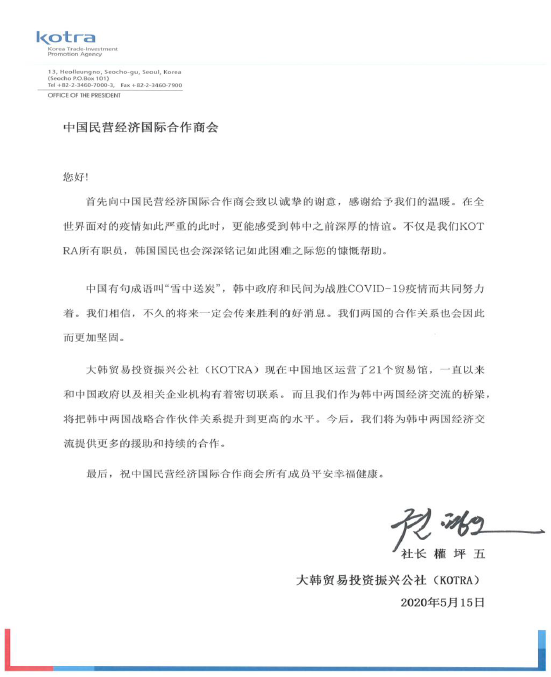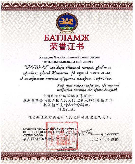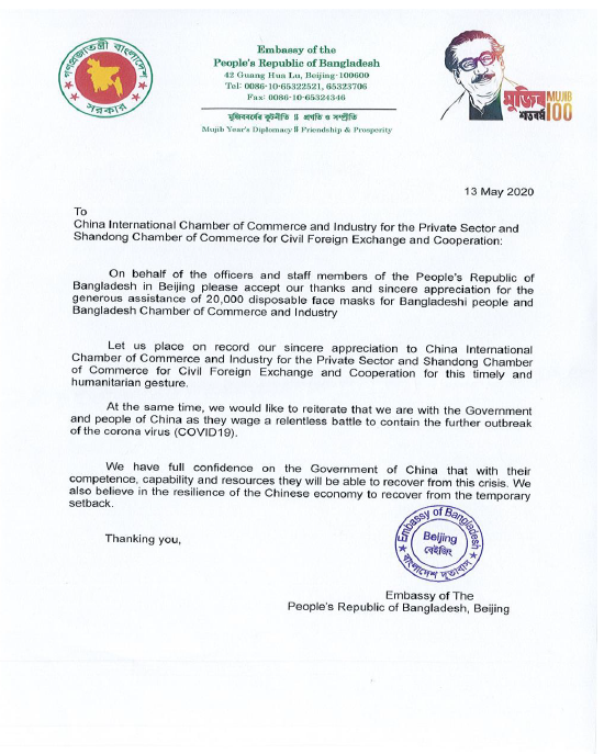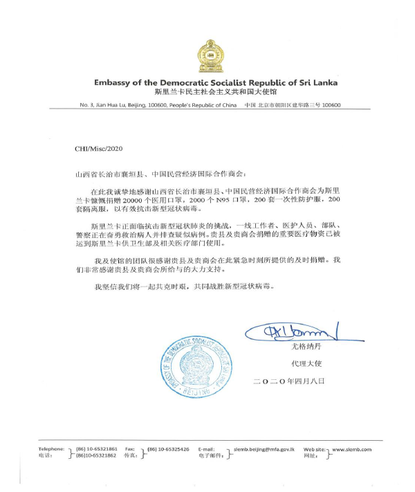 为贯彻落实习近平主席“打造人类卫生健康共同体”伟大倡议和党中央号召,发挥民间组织在抗疫斗争中的桥梁纽带作用,经全国工商联同意,由我会党委发起并与广东、山东、福建民营经济国际合作商会(促进会)合作主办,开展了“山川异域大爱无疆·爱心颂”公益捐助活动。以3月30日在斯里兰卡驻华大使馆举行第一笔捐赠活动仪式为开端,先后为印度、斯里兰卡、蒙古、韩国、孟加拉国、老挝等十余个国家的工商会送去近80多万元的防护用品,支持这些国家工商会防控工作,受到亚太贸易协定工商会成员国和“一带一路”沿线相关国家真切欢迎、广泛肯定和赞誉。目前已有四国驻华使馆代表本国政府和人民正式致函感谢。现将函件转发,以回应广大读者对于我们的关切和支持。