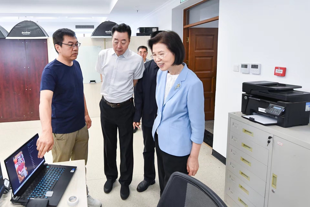 7月12日上午,中央统战部副部长、全国工商联党组书记沈莹到中华工商时报社、全国工商联商会发展服务中心、中国民营经济研究会等直属单位走访调研。这是沈莹在报社新媒体部了解新媒体产品制作情况。张雷/摄