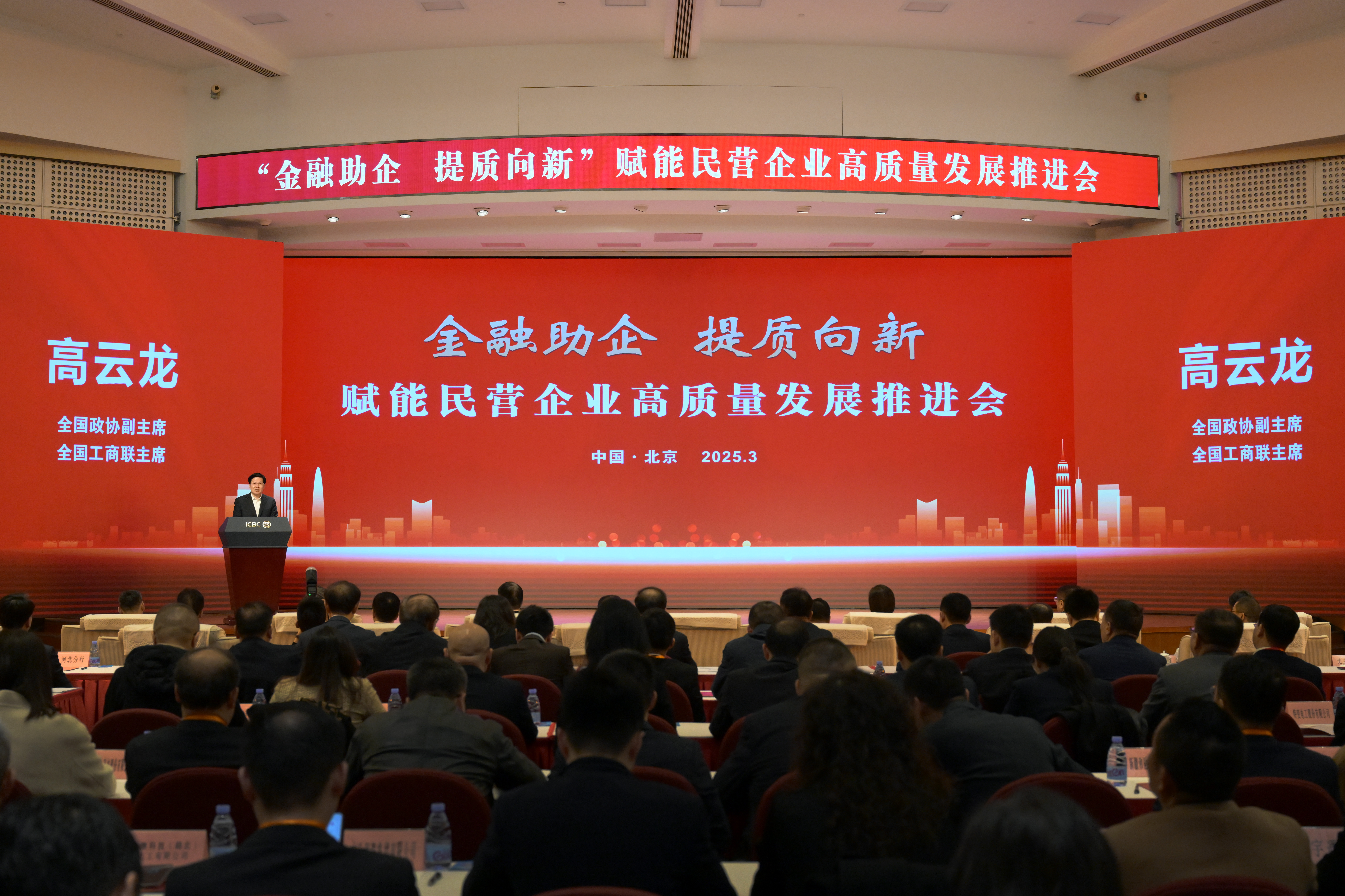 为深入学习贯彻习近平总书记在民营企业座谈会上的重要讲话精神,3月12日,全国工商联与中国工商银行在京举办“金融助企 提质向新”金融赋能民营企业高质量发展推进会。全国政协副主席、全国工商联主席高云龙,中央统战部副部长、全国工商联党组书记沈莹,全国工商联副主席安立佳,工信部总工程师谢少锋,中国工商银行董事长廖林、行长刘珺、副行长张守川出席会议。