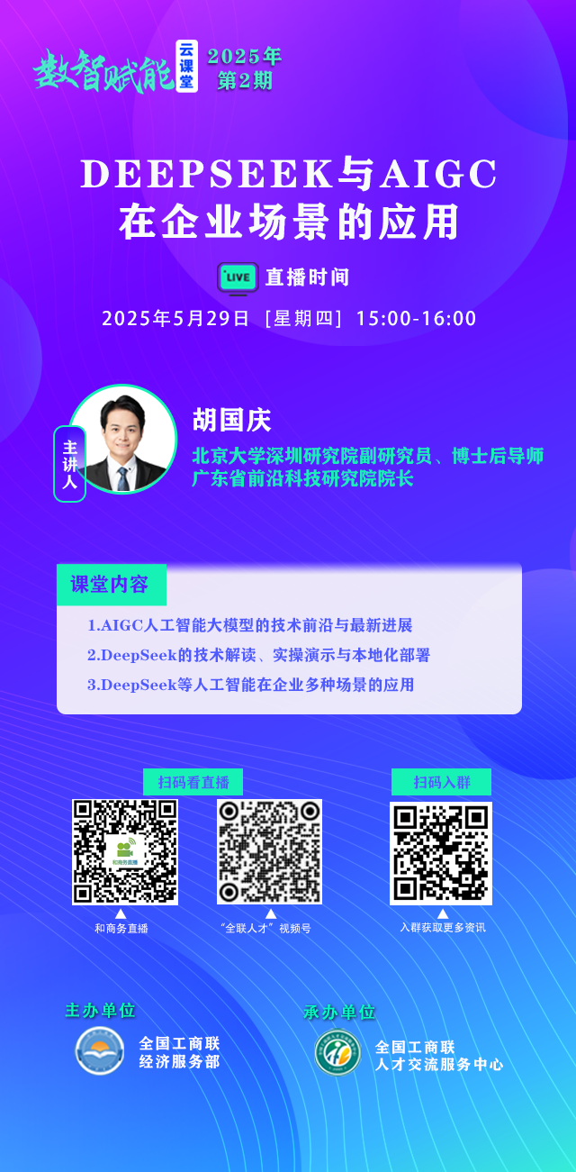本期云课堂主题为“DeepSeek与AIGC在企业场景的应用”,邀请北京大学深圳研究院副研究员、博士后导师、6G与人工智能课题组组长胡国庆,围绕AIGC人工智能大模型的前沿技术与最新进展,DeepSeek的技术解读、实操演示与本地化部署,DeepSeek等人工智能在企业多场景的应用等一系列内容进行讲解。欢迎大家届时扫码观看。