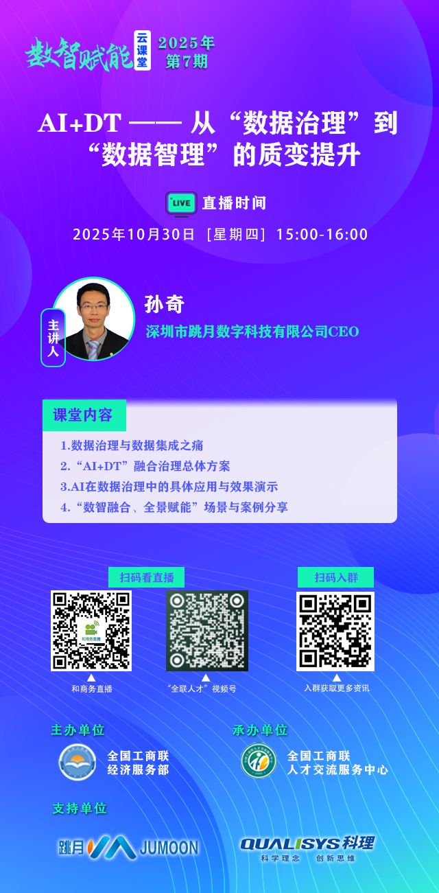 由全国工商联经济服务部主办、全国工商联人才交流服务中心承办的2025年“数智赋能云课堂”第7期将于10月30日15:00-16:00正式开播。