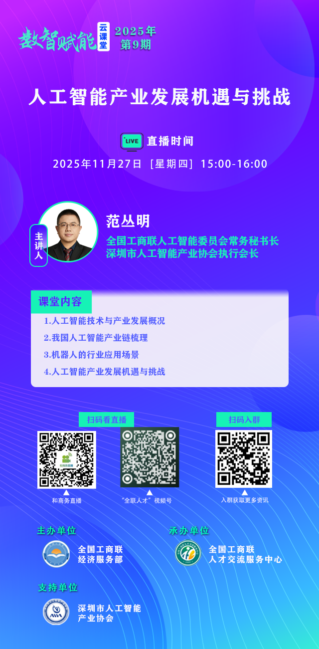 由全国工商联经济服务部主办,全国工商联人才交流服务中心承办的2025年“数智赋能云课堂”第9期将于11月27日15:00-16:00正式开播。