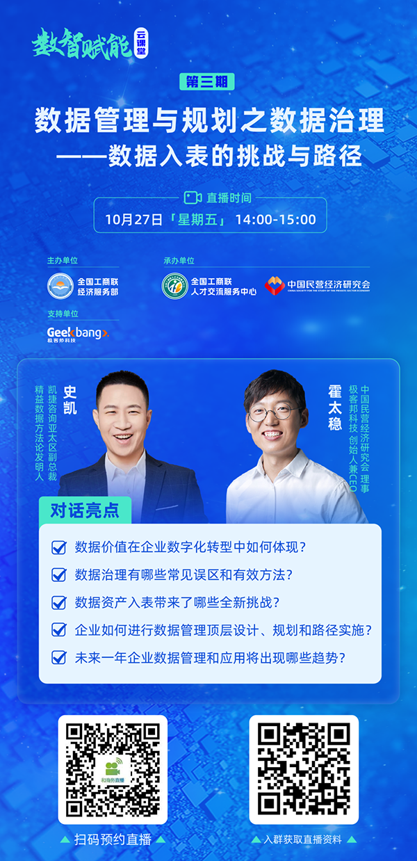 10月27日14:00-15:00,“数智赋能云课堂”第3期直播将围绕“数据管理与规划之数据治理”主题,邀请中国民营经济研究会理事、极客邦科技创始人兼CEO霍太稳与凯捷咨询亚太区副总裁、精益数据方法论发明人史凯进行对话,深入探讨数据价值在企业数字化转型中如何体现,数据资产入表带来的全新挑战,以及企业如何进行数据管理顶层设计、规划和路径实施。