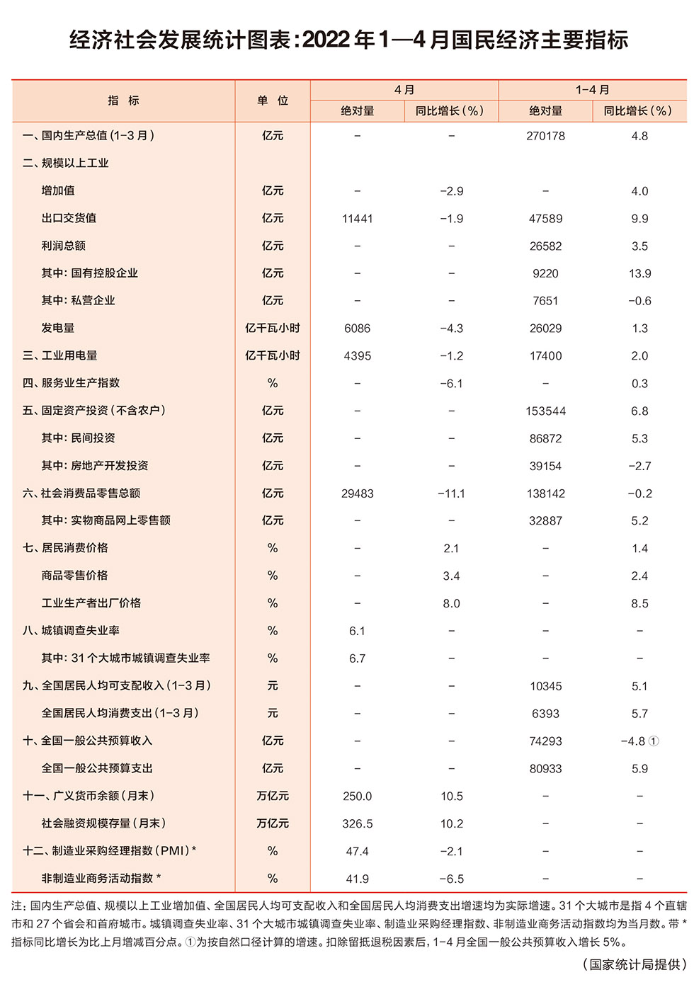 国家统计局:2022年1—4月国民经济主要指标