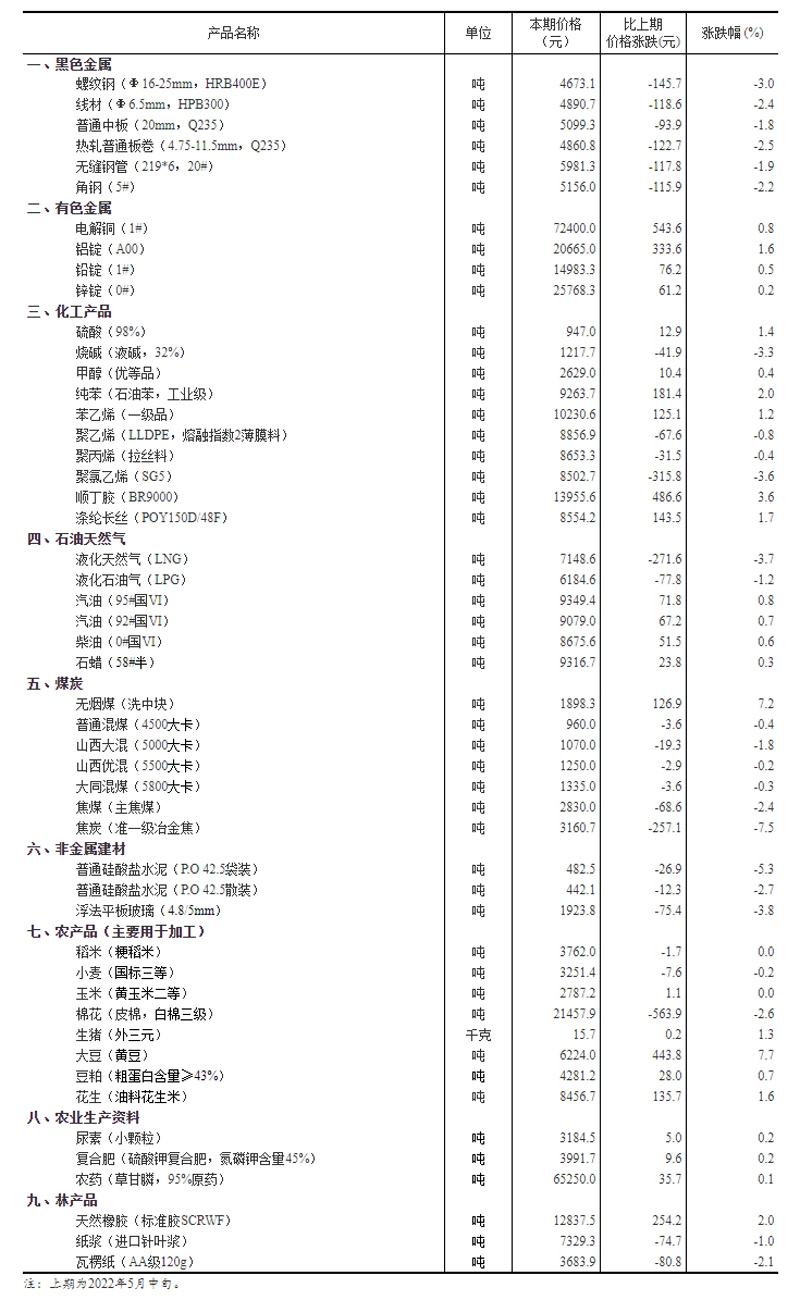 2022年5月下旬流通领域重要生产资料市场价格变动情况