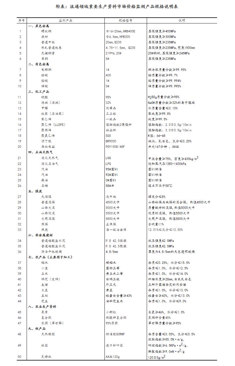 流通领域重要生产资料市场价格监测内容包括9大类50种产品的价格。类别与产品规格说明详见附表。