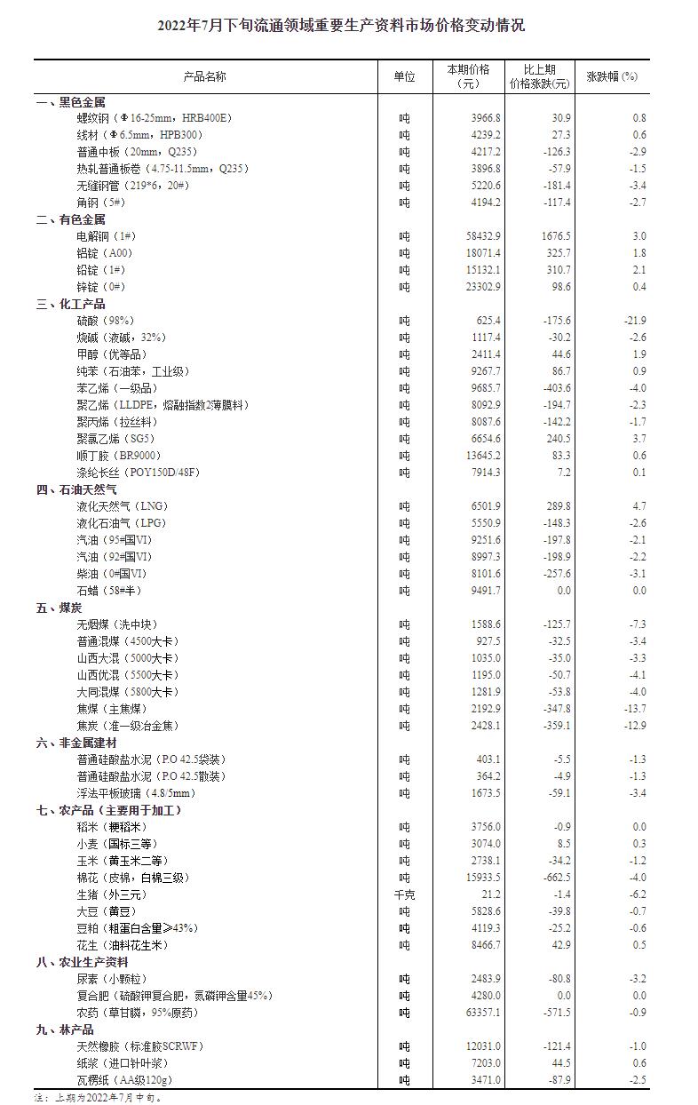 国家统计局:2022年7月下旬流通领域重要生产资料市场价格变动情况