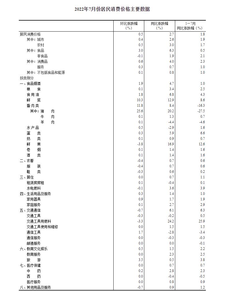 国家统计局:2022年7月份居民消费价格同比上涨2.7% 环比上涨0.5%