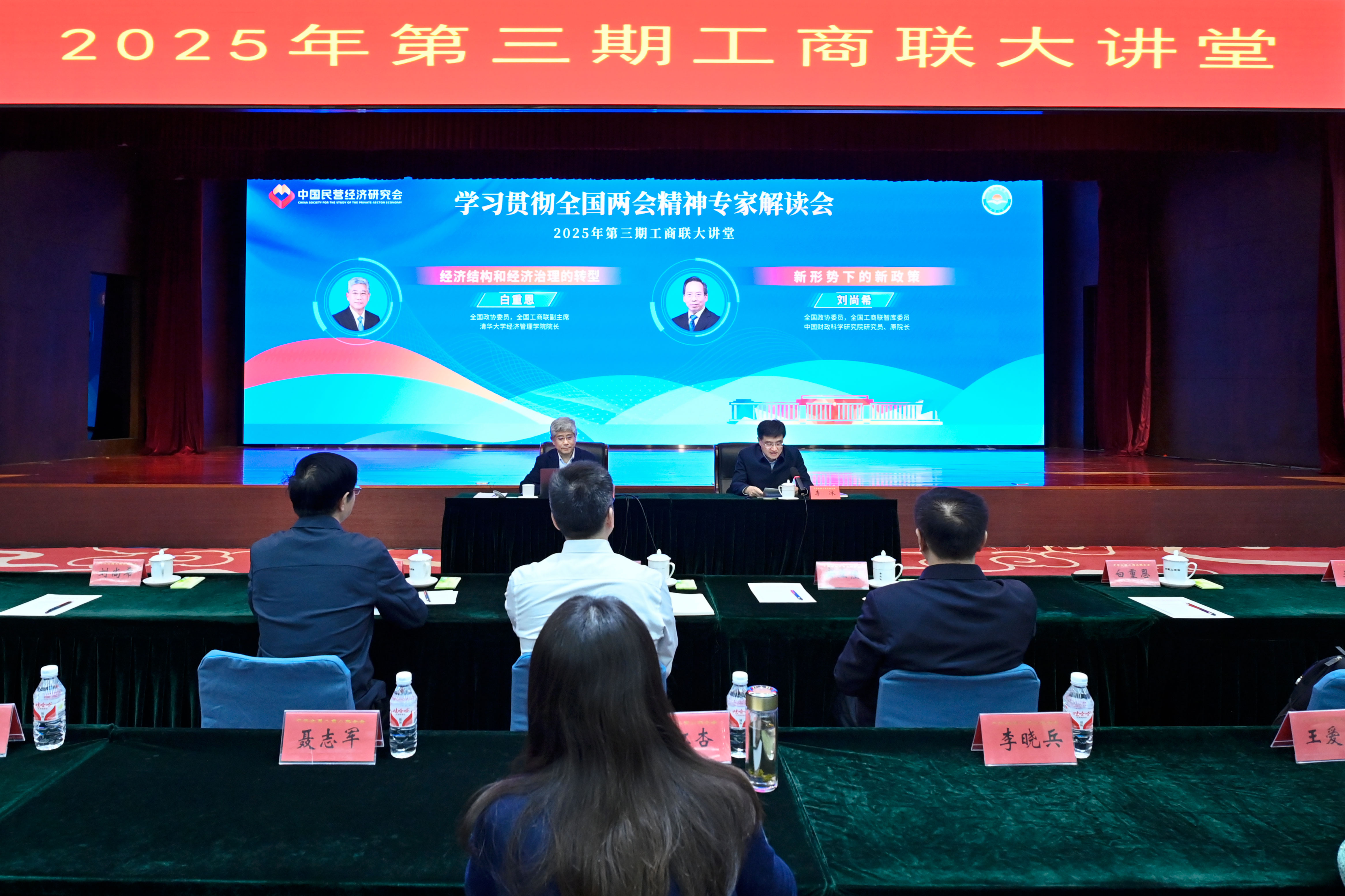全国政协委员、全国工商联副主席、清华大学经济管理学院院长白重恩,全国政协委员、全国工商联智库委员刘尚希,围绕学习贯彻习近平总书记在全国两会期间发表的系列重要讲话和政府工作报告,准确把握党中央决策部署,扎实推进民营经济健康发展、高质量发展,分别从不同角度进行宣讲解读。