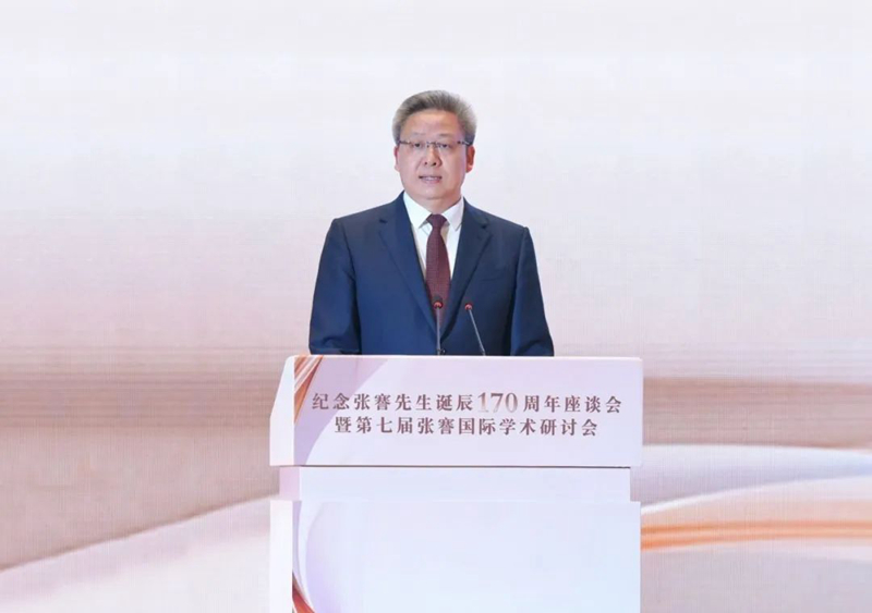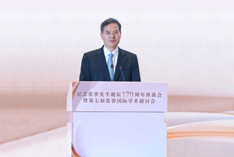 吴新明在致辞中感谢社会各界长期以来给予南通的关心和支持。他说,百年以来,张謇先生的家国情怀、开放胸襟、创新精神、诚信品格和民本意识,已经深深镌刻在南通的城市基因中,不断激励着一代代江海儿女强毅力行、逐梦未来。今天的南通,产业实力日趋雄厚,双向开放稳步拓展,创新动能不断增强,文明气质日益彰显,民生福祉持续改善。纪念,是为了更好地前行。我们缅怀和纪念张謇先生,就是要传承先贤崇高精神,并赋予新的时代内涵,全面点燃江海儿女奋进现代化、建功新征程的如火激情,再创近代民族工业发祥地的荣光,续写“中国近代第一城”的辉煌。
