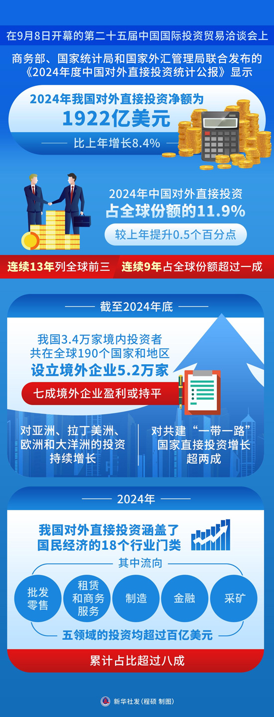 2024年我国对外直接投资净额1922亿美元 比上年增长8.4%