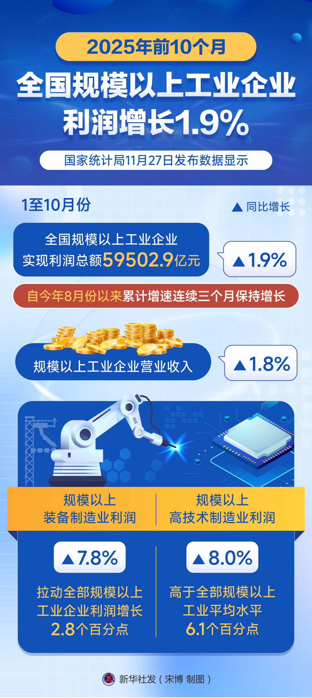 2025年前10个月全国规模以上工业企业利润增长1.9%