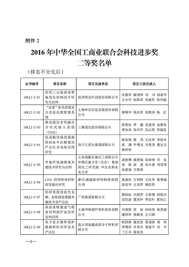 2.2016年中华全国工商业联合会科技进步奖二等奖名单