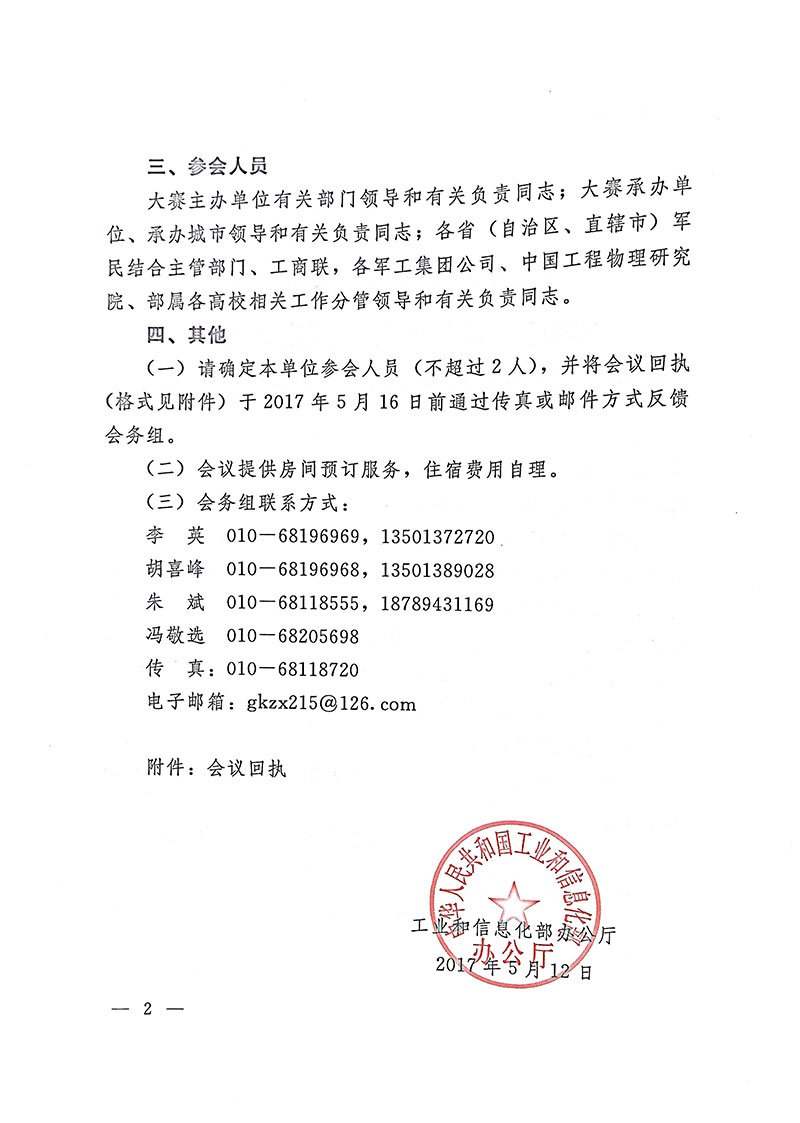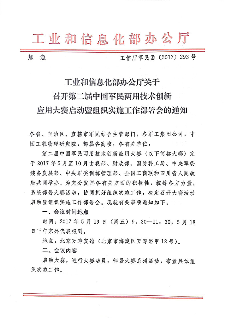 第二届中国军民两用技术创新应用大赛(以下简称大赛)定于2017年5月至10月由工业和信息化部、财政部、国防科工局、中央军委装备发展部、中央军委训练管理部、全国工商联和四川省人民政府共同举办。为确保充分了解和掌握大赛要求,做好本地区或商会会员企业参赛组织工作,请你们按照《工业和信息化部办公厅关于召开第二届中国军民两用技术创新应用大赛启动暨组织实施工作部署会的通知》(工信厅军民函〔2017〕293号)要求,及时将本单位人员参会回执于2017年5月16日前通过传真或邮件方式反馈会务组(详见通知)。