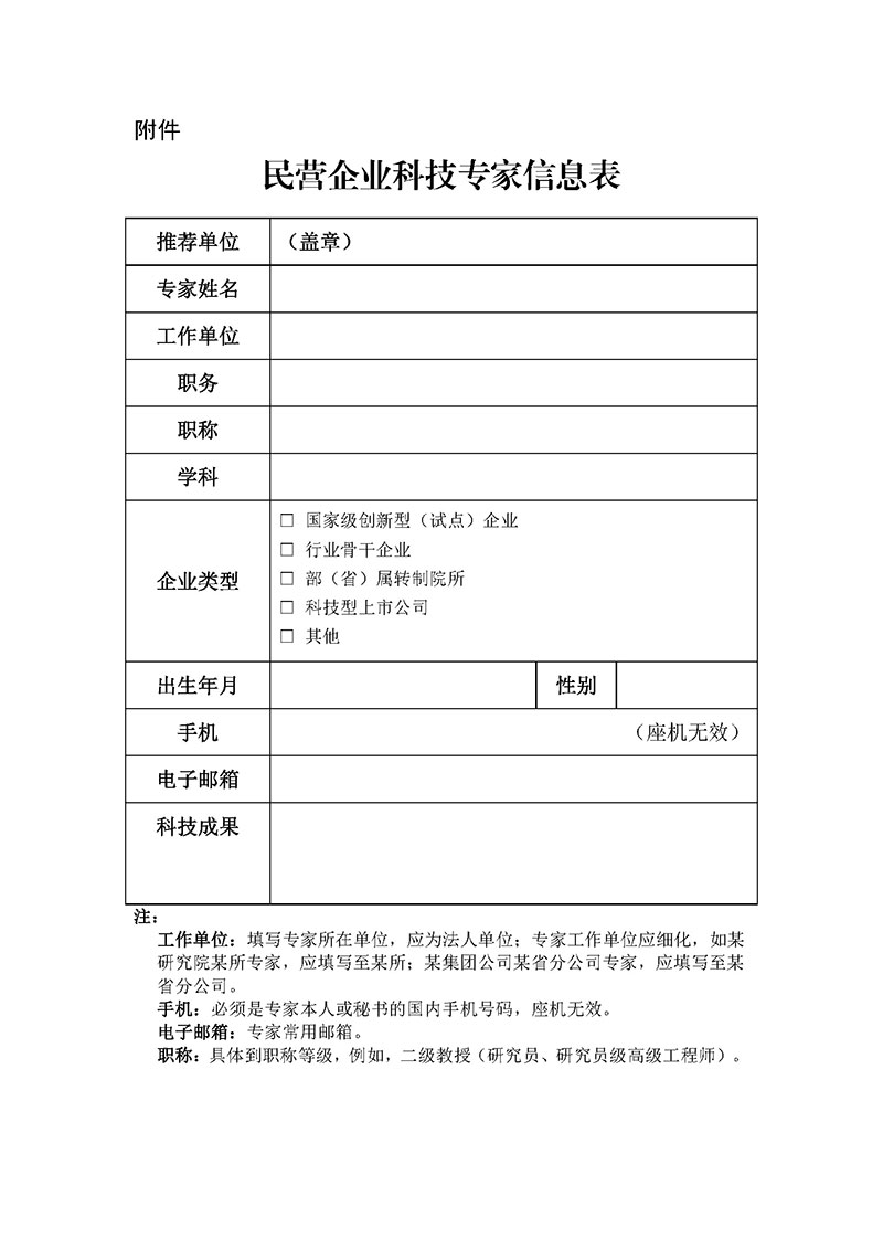 请重点推荐热心国家科技奖励事业的民营企业科技专家,保证推荐质量,名额不限。请于12月10日前将专家信息表(见附件)盖章后传真至全国工商联经济部。