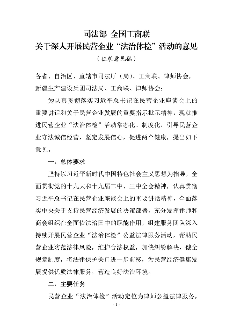 《司法部 全国工商联关于深入开展民营企业“法治体检”活动的意见》征求意见建议