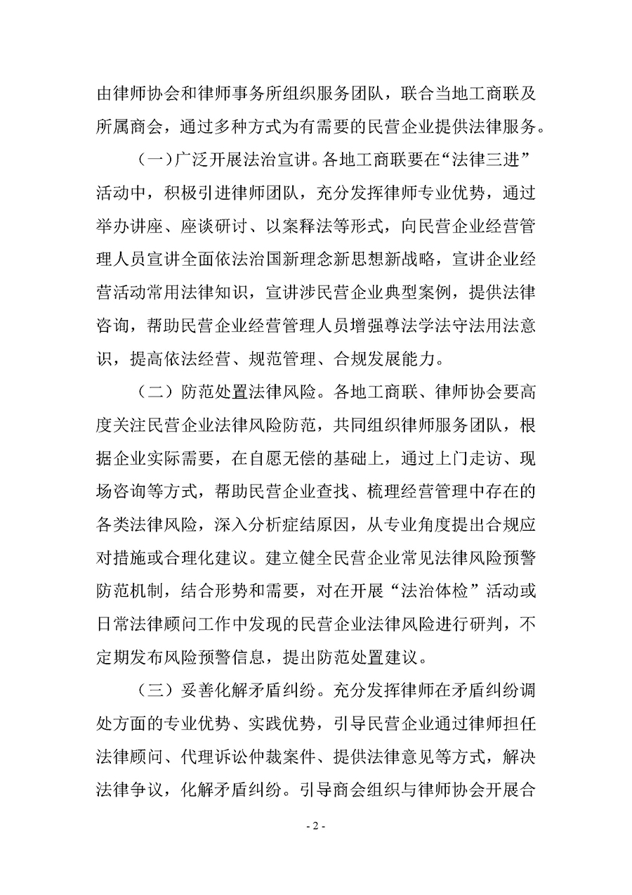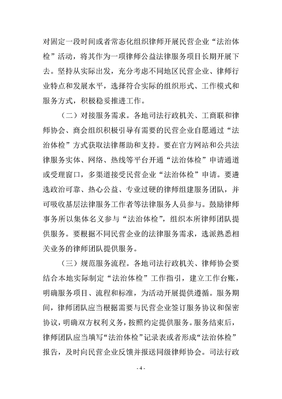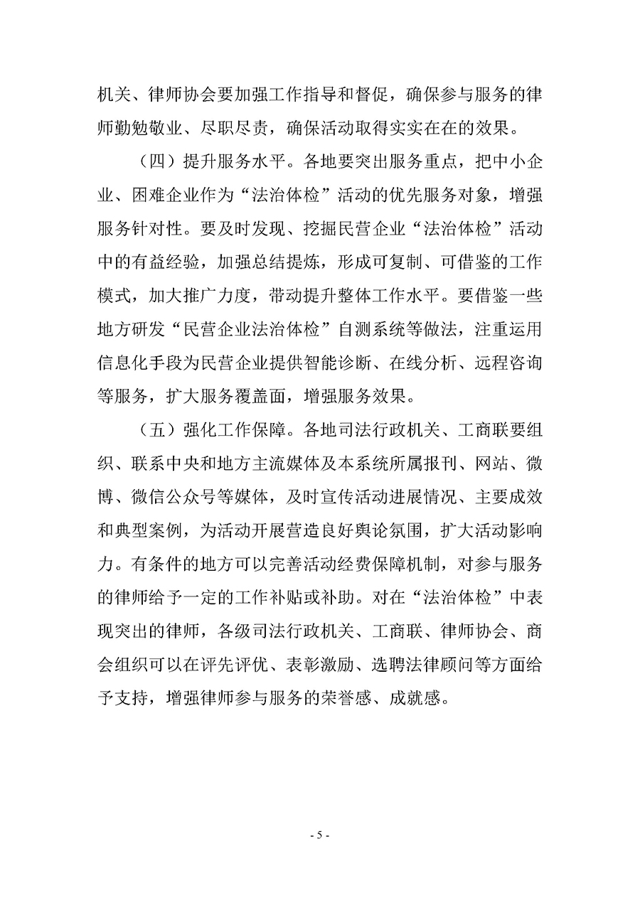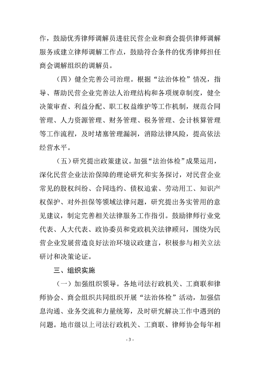 为认真贯彻落实习近平总书记在民营企业座谈会上的重要讲话和关于民营企业发展的重要指示批示精神,引导民营企业守法诚信经营,坚定发展信心,促进两个健康,司法部、全国工商联将共同推动、持续开展民营企业“法治体检”公益法律活动。