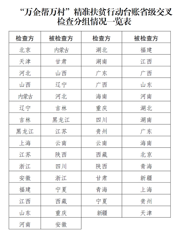 全国“万企帮万村”精准扶贫行动领导小组决定对台账工作开展省际交叉检查。为确保各项工作顺利实施,现制定本方案。