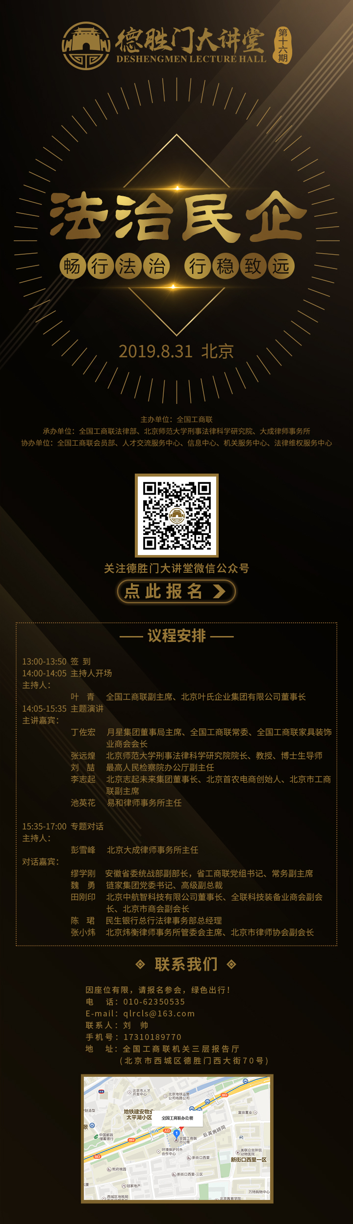 全国工商联主办的第十六期德胜门大讲堂定于2019年8月31日(星期六)14点在全国工商联机关三层报告厅举办,本期大讲堂的主题是“法治民企--畅行法治 行稳致远”。