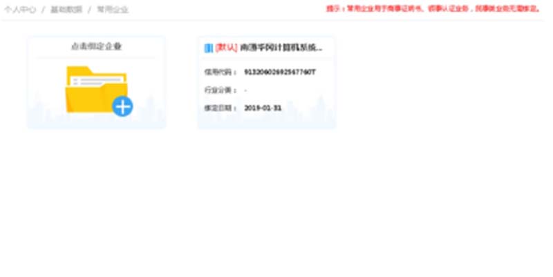 登录后,进入“个人中心”页面,在左侧菜单中找到“基础数据”——“常用企业”页面,进入此页面绑定企业信息。此功能主要是用于商事证明书、领事认证业务,民事类业务无需绑定。