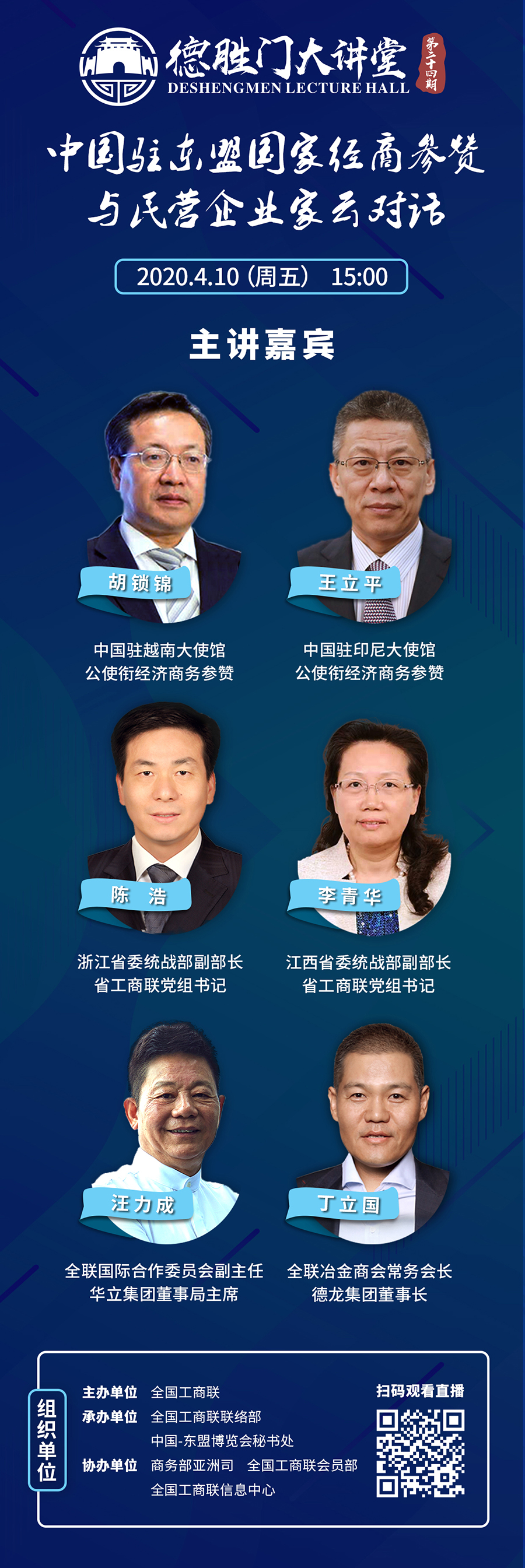 疫情来袭,谁都不能是旁观者。面对海外疫情和国际局势的加速演变,中国走出去民营企业怎么办?作为民营企业“娘家”的工商联怎么做?我们驻外使馆的外交官们怎么看?全国工商联主办的第二十四期德胜门大讲堂——“中国驻东盟国家经商参赞与民营企业家云对话”定于2020年4月10日(星期五)15:00通过网络直播。本期大讲堂的主题是疫情冲击下民营企业在东盟投资发展的挑战与应对。