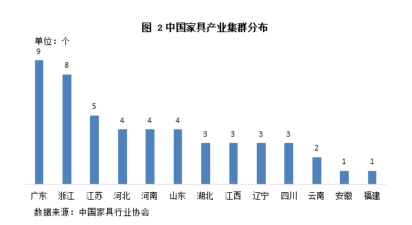 广东和浙江为我国家具最重要的产区。据中国家具行业协会统计,中国家具产业集群50个,分布在珠三角、长三角、环渤海、东北、中部、西部6大地区。其中,珠三角家具产业规模最大,长三角家具产业平均增速最快。根据中国家具行业协会的统计数据,广东省共有9个家具产业集群是我国最大的家具产区,其次是浙江省,有8个产业集群。