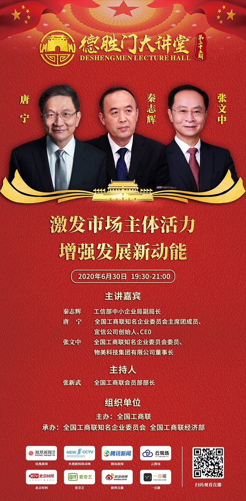 为鼓励引导广大民营企业克服当前疫情不利影响,以“两会”精神为指引,坚定发展信心,努力实现破局发展,全国工商联以“激发市场主体活力,增强发展新动能”为主题,邀请工信部领导及企业家嘉宾,于6月30日晚在线举办第25期 “德胜门大讲堂”活动。