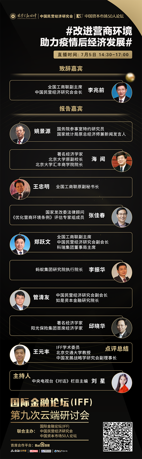 由国际金融论坛(IFF)、中国民营经济研究会、中国资本市场50人论坛联合主办的“改进营商环境助力疫情后经济发展”云端研讨会将于7月5日14:30–17:00召开。届时多位知名经济学家、企业家将从不同角度探讨如何优化营商环境、助力疫情后的经济恢复和发展。欢迎大家扫码收看直播。
