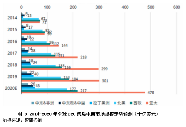 在疫情的推动下,“宅经济”在全球范围内崛起,进一步促进跨境电商B2C的发展。智研咨询公开数据显示,2020年全球跨境电商B2C交易额预计将接近1万亿美元,年平均增速将接近30%,远超传统货物贸易增长速度。艾媒咨询调查结果显示,亚太地区成为全球跨境电商B2C发展最为强劲的地区;拉美、中东欧/中亚、中东/非洲等地区是跨境电商B2C发展的新兴市场,其中,拉美地区以超过40%以上的年均增速成为全球跨境电商B2C增长最快的地区。