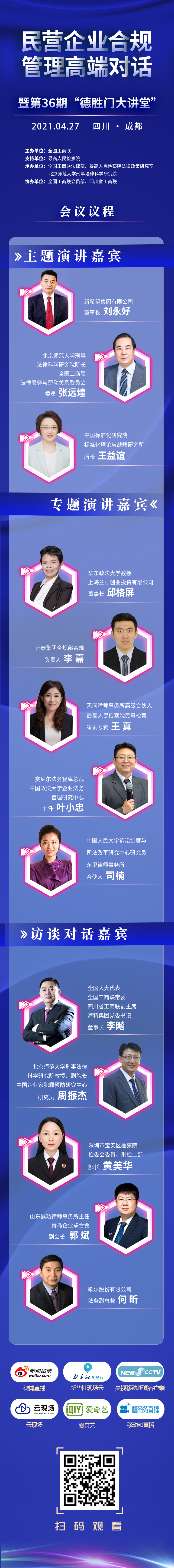 为深入学习贯彻习近平法治思想,推动民营企业厚植法商素养,守法诚信经营,提高合规管理和防范法律风险能力,实现高质量发展,4月27日下午14时30分,全国工商联在四川成都举办民营企业合规管理高端对话暨第36期“德胜门大讲堂”活动。活动共设置领导致辞、主题演讲、专题演讲和访谈对话四个环节,最高人民检察院、全国工商联有关领导出席活动并致辞,对话活动邀请到新希望集团刘永好等知名企业家,张远煌、王益谊、叶小忠、邱格屏等专家学者,正泰集团、歌尔股份等企业合规负责人以及司南、王真等资深律师不同领域代表共13人,围绕共促民营企业合规管理进行分享和讨论。