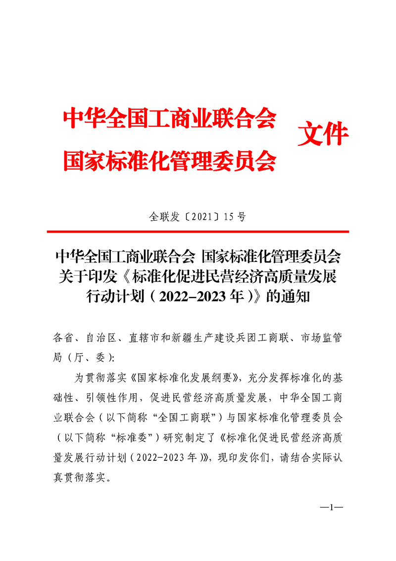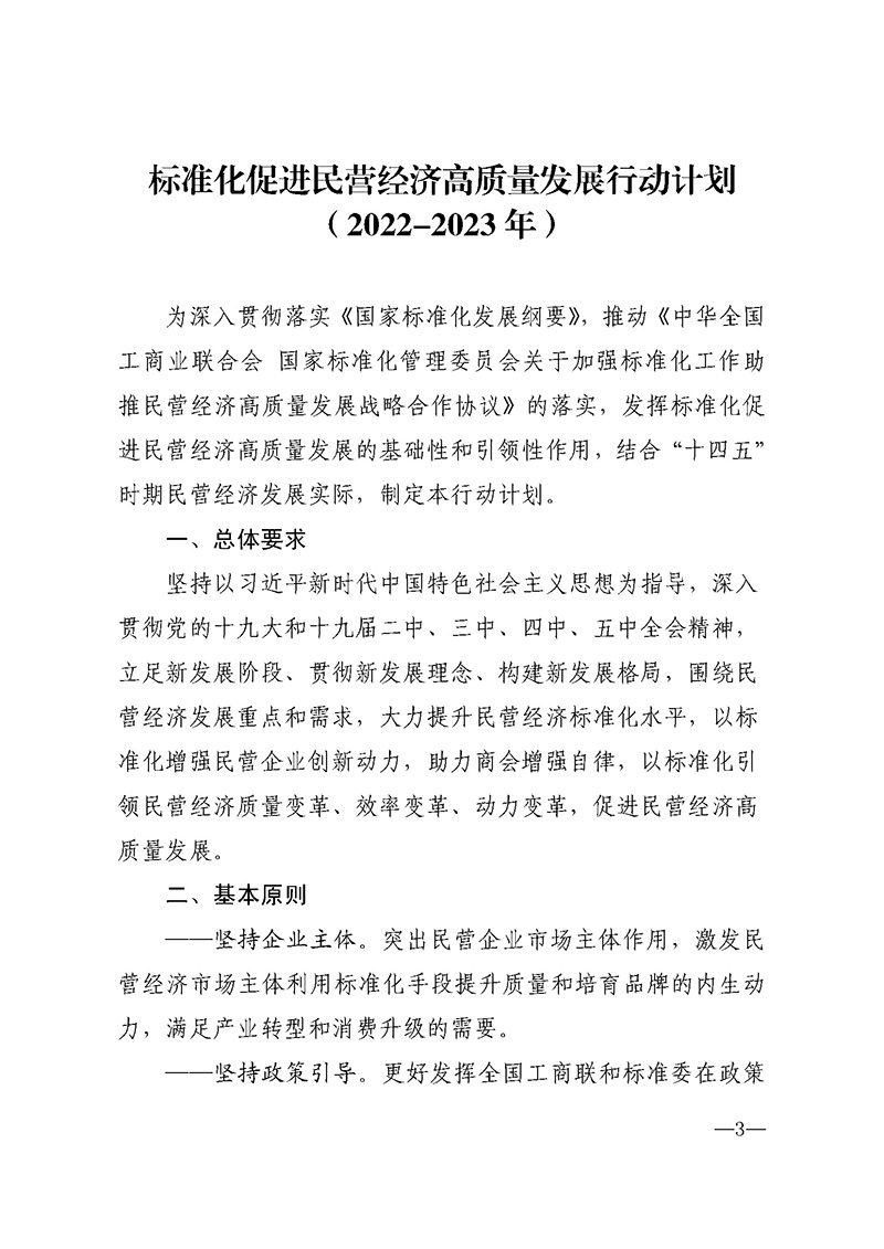 中华全国工商业联合会 国家标准化管理委员会关于印发《标准化促进民营经济高质量发展行动计划(2022-2023年)》的通知