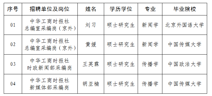 按照《全国工商联直属单位2022年度公开招聘工作人员公告》和事业单位公开招聘工作有关规定,现将我会直属单位中华工商时报社、中华工商联合出版社有限责任公司2022年度拟聘应届高校毕业生人员予以公示(公告)。期间,如有异议,请向我会和用人单位反映,或直接通过中央和国家机关所属事业单位公开招聘服务平台反映。