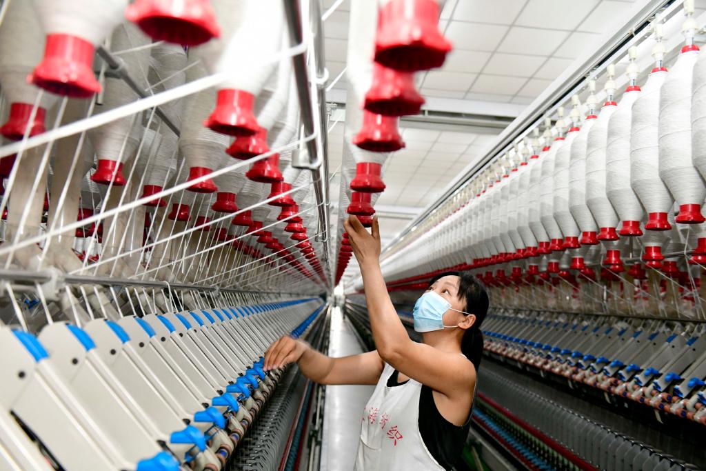 在山东省菏泽市郓城县蓝翔纺织有限公司,工作人员在织机前忙碌(2025年3月12日摄)。新华社记者 郭绪雷 摄