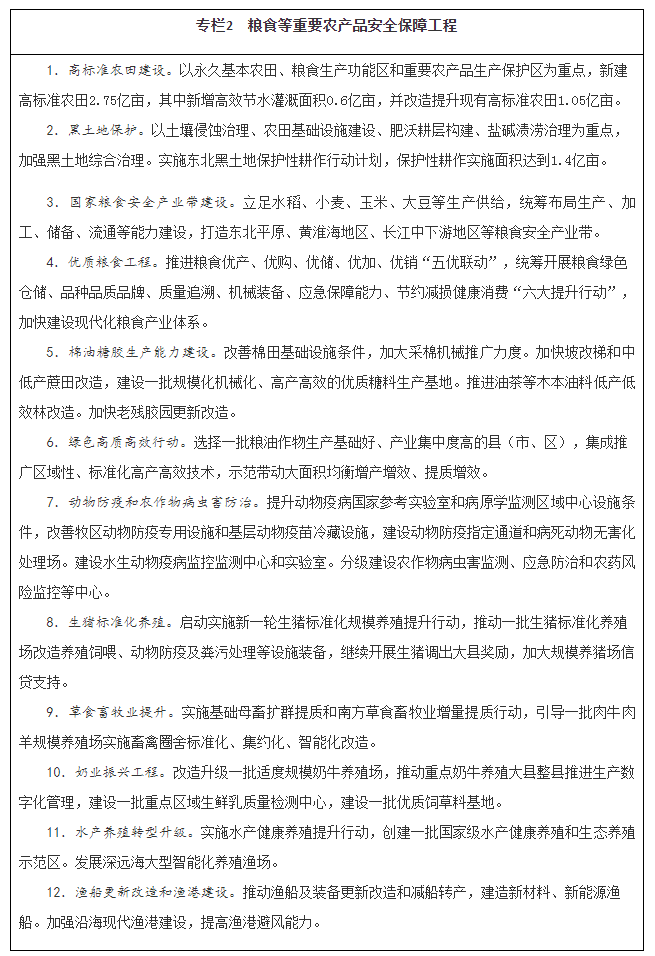 ——粮食等重要农产品供给有效保障。粮食综合生产能力稳步提升,产量保持在1.3万亿斤以上,确保谷物基本自给、口粮绝对安全。生猪产能巩固提升,棉花、油料、糖料和水产品稳定发展,其他重要农产品保持合理自给水平。