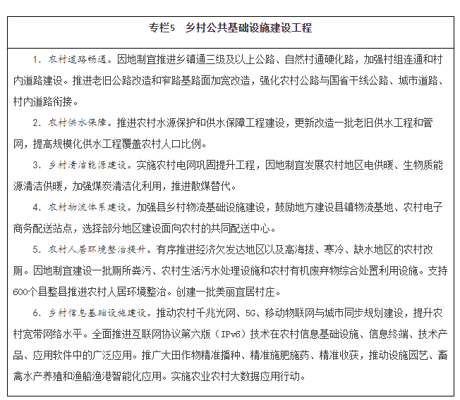 加强乡村信息基础设施建设。实施数字乡村建设工程。加快农村光纤宽带、移动互联网、数字电视网和下一代互联网发展,支持农村及偏远地区信息通信基础设施建设。加快推动遥感卫星数据在农业农村领域中的应用。推动农业生产加工和农村地区水利、公路、电力、物流、环保等基础设施数字化、智能化升级。开发适应“三农”特点的信息终端、技术产品、移动互联网应用软件,构建面向农业农村的综合信息服务体系。